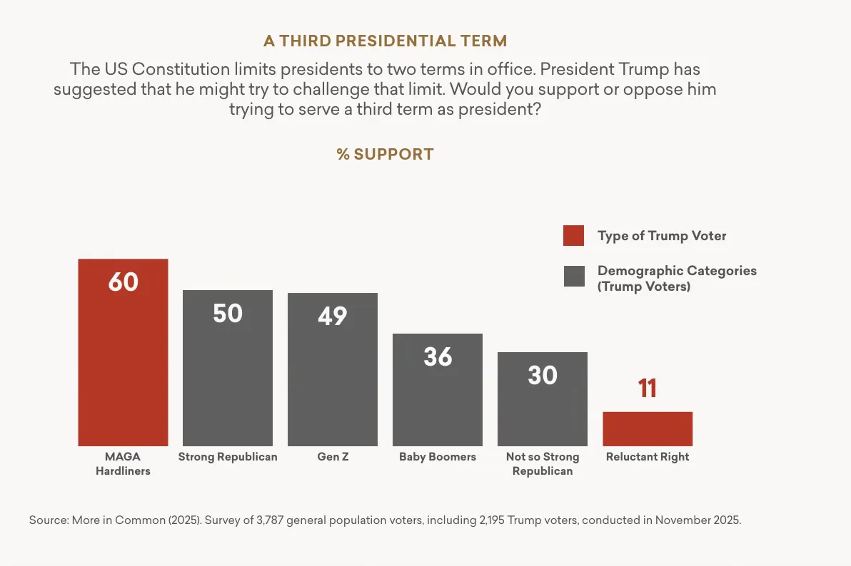 Similarly, MAGA Hardliners are more likely than “strong Republicans” and Gen Z Trump voters, including Gen Z men, to support President Trump pursuing a third term. The Reluctant Right are less than half as likely to support such a measure than even “not so strong Republicans” who voted for Trump.
